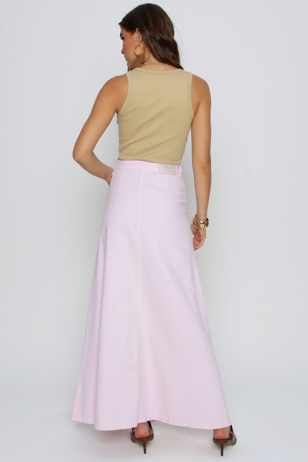 Saia Midi De Sarja é uma peça versátil e elegante, com modelagem levemente evasê que proporciona movimento e conforto. Seu design clean permite composições tanto casuais quanto sofisticadas, ideal para diferentes ocasiões.