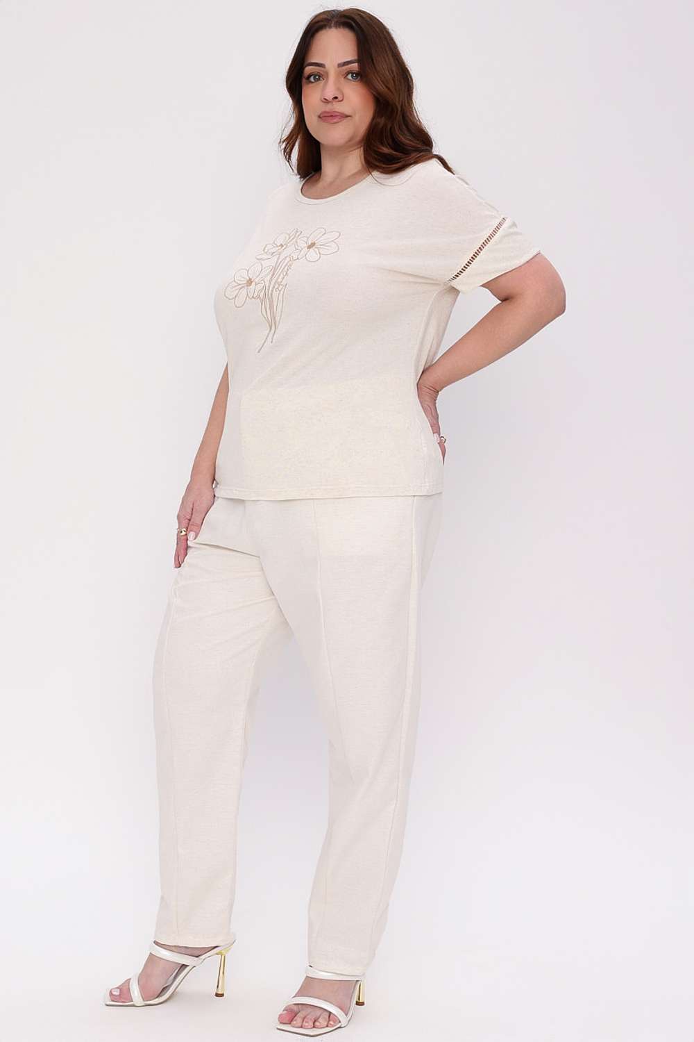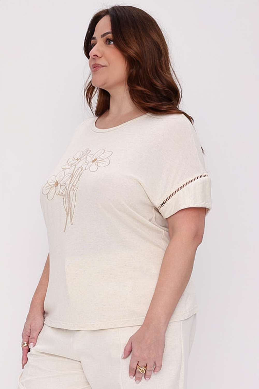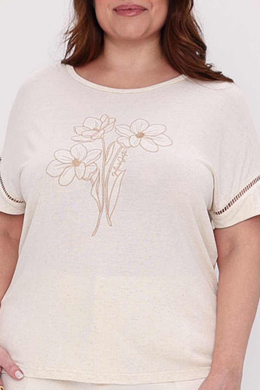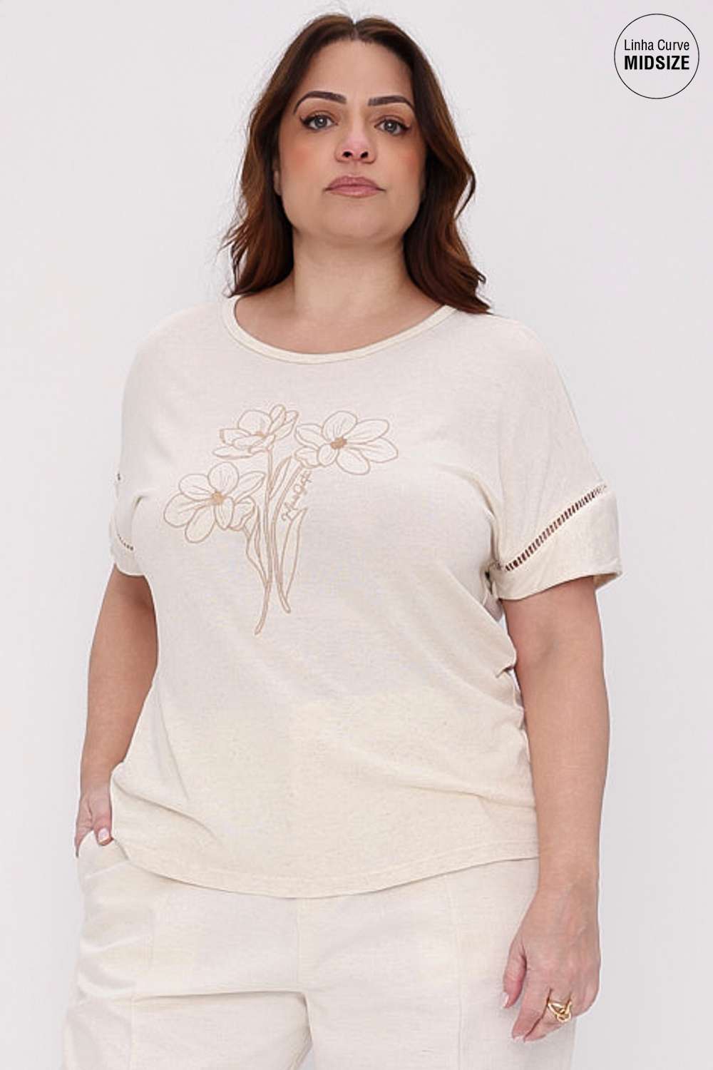 A Ampla Flowers Mais Gata traz um visual leve e feminino, com bordado floral que adiciona charme sem perder a proposta moderna e descomplicada da peça. O caimento soltinho deixa o look confortável e elegante para qualquer ocasião.