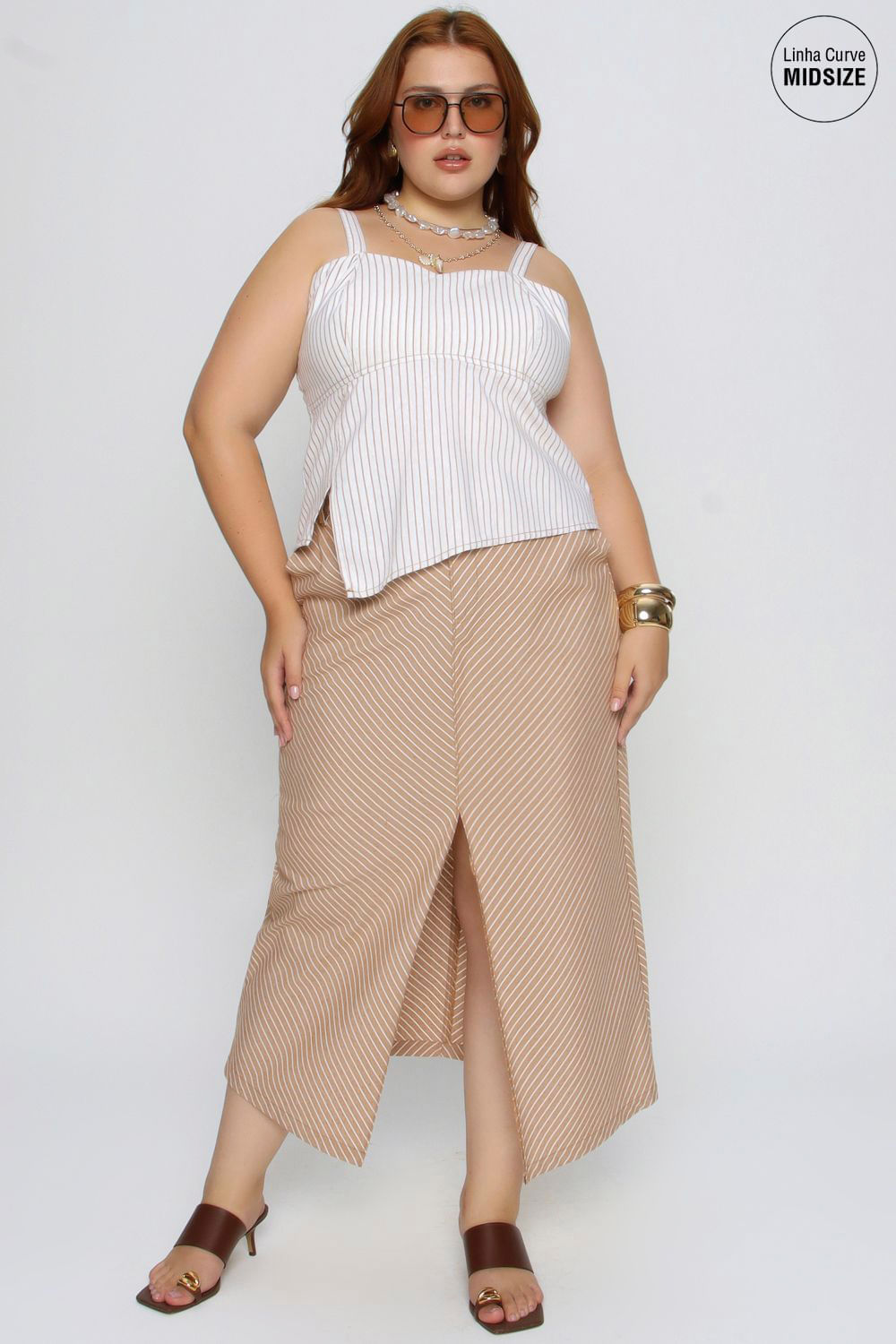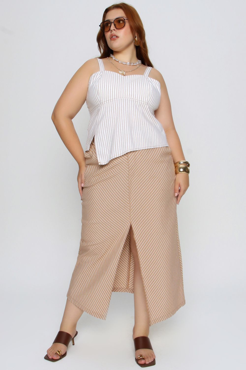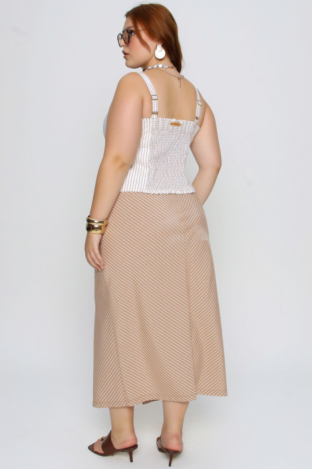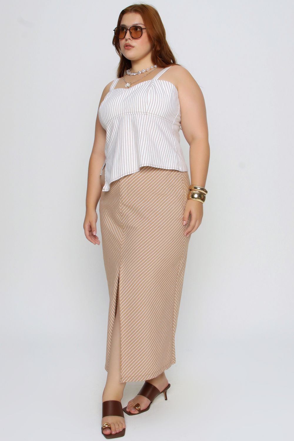 A Saia Alongada Mais Gata combina sofisticação e conforto em uma peça versátil para o dia a dia. Com estampa listrada clássica e fenda frontal, garante movimento e um visual moderno, ideal para produções casuais ou elegantes.