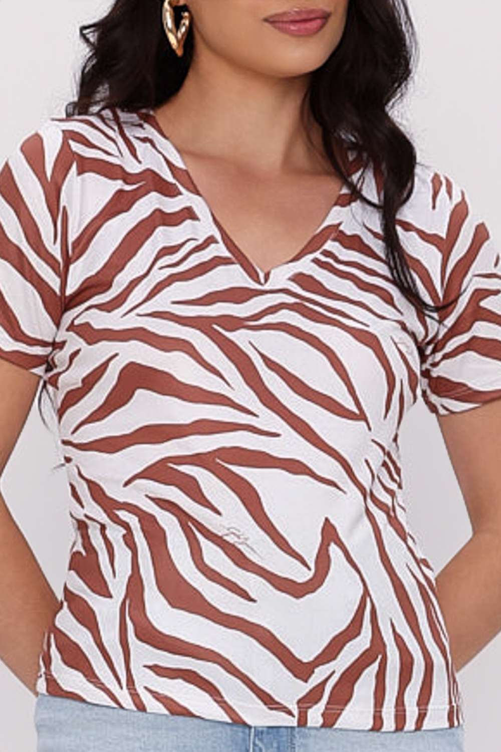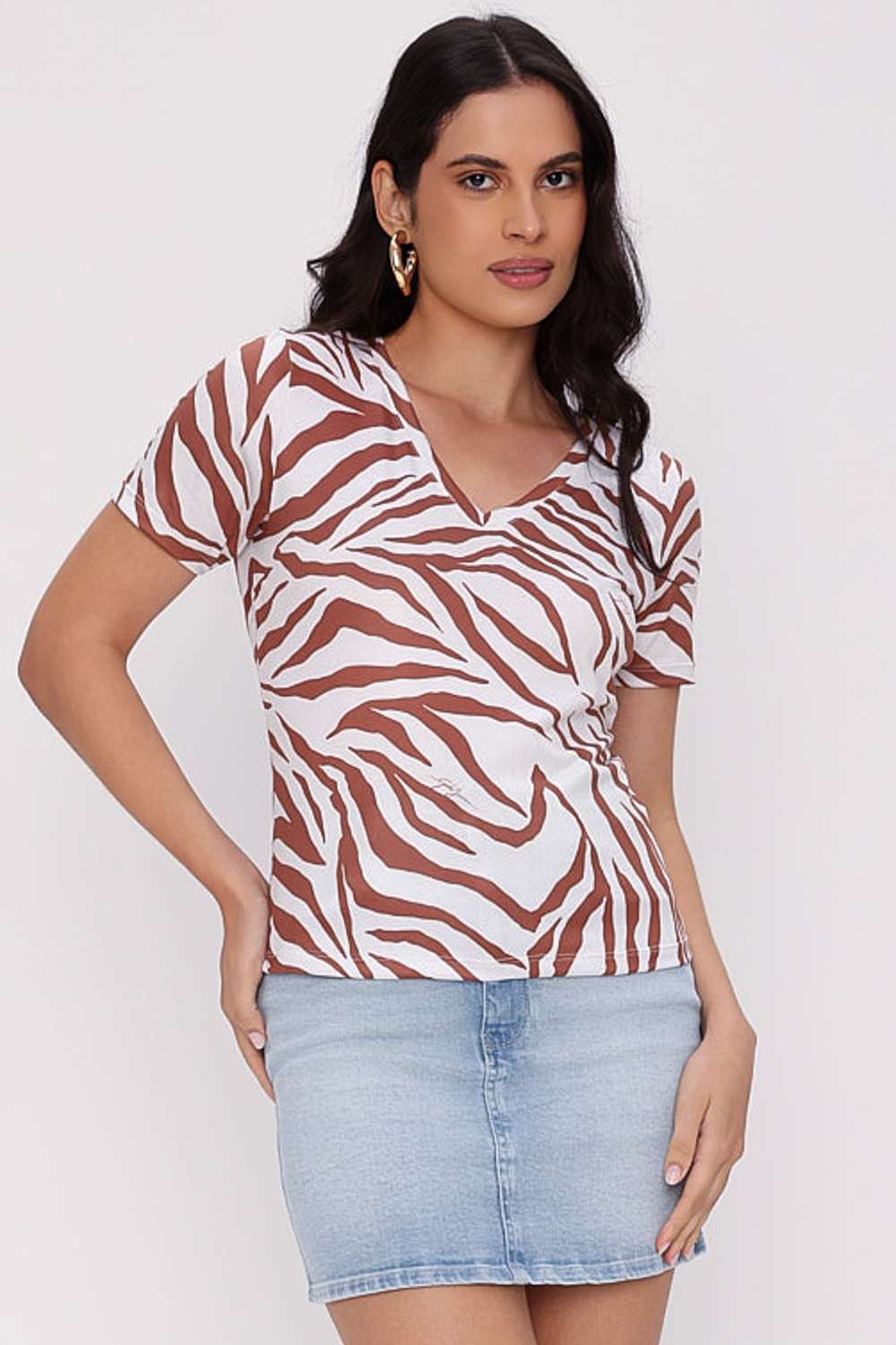 T Shirt Slim Summer Jeans traz modelagem ajustada ao corpo com comprimento clássico para coordenar com saias e calças de cintura alta. O decote em V valoriza o colo e a padronagem orgânica atualiza o visual do dia a dia sem exageros.