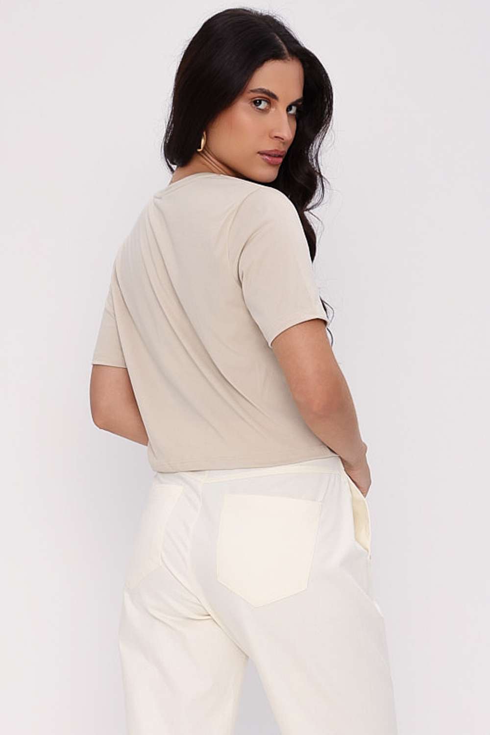 • Gola redonda e mangas curtas com caimento estruturado