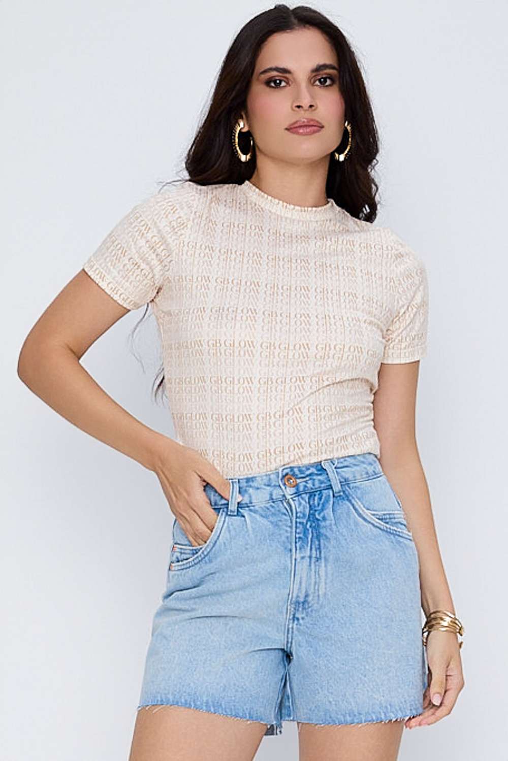 Tshirt GB New Year Wishes traz a identidade da coleção com estampa monogramada GB GLOW em padrão corrido, modelagem justa e gola levemente mais alta — perfeita para elevar produções do dia a dia.