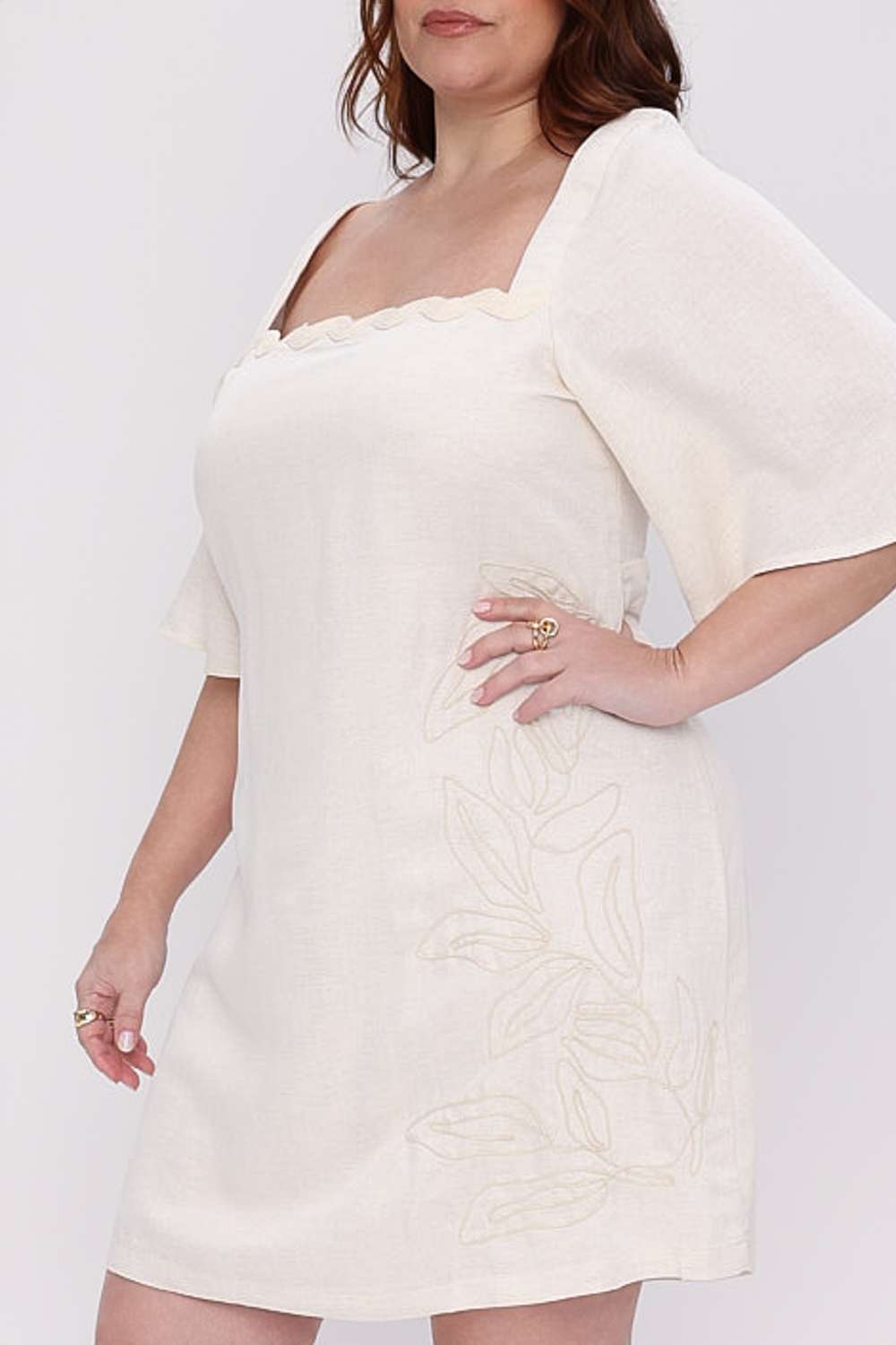 O Vestido Solto Iara Mais Gata tem modelagem reta e confortável, com comprimento acima do joelho e visual leve para o dia a dia. O decote quadrado com recorte ondulado chama atenção na parte frontal, enquanto as mangas amplas trazem movimento delicado aos ombros. Na lateral, o bordado em desenho orgânico adiciona um toque artesanal que valoriza o design da peça.